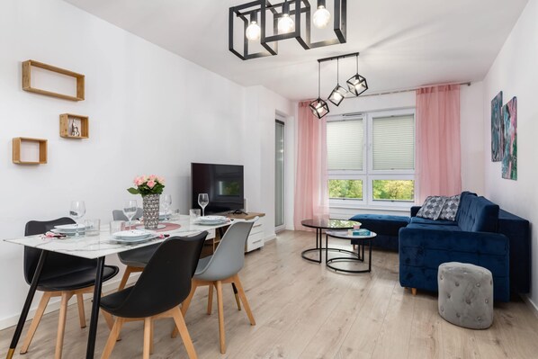 This prestigious and fully equipped apartment can accommodate up to 8 people. The area of ​​82 m² is divided into a living room with a double sofa bed, a kitchenette, 3 bedrooms with comfortable beds, a toilet and a bathroom with a shower. The interior design of the apartment impresses with its modernity and attention to every nuance - from decorative elements to color details of the equipment. The functionality also matches the aesthetics, and the comfortable furniture and comprehensive kitchen, bathroom and multimedia equipment ensure a pleasant and stress-free stay. A spacious balcony with garden furniture adds a holiday aura - it is the perfect place for morning coffee or long talks on warm summer evenings. Guests with cars can park for free in the public car park. Additionally, parents traveling with a child can also book a cot for their child.