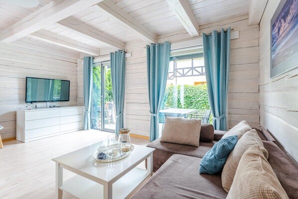 Feriestedet tilbyr komfortable toetasjes rekkehus med utmerket beliggenhet (nær stranden, i et rolig nabolag). Hvert hus har en overbygd terrasse og en privat hage, perfekt for avslapning og grilling. Barna kan kose seg på den lille lekeplassen. De moderne trehusene har plass til 8 personer. Hvert hus har en stue i første etasje (dobbel sovesofa, TV og spisebord) koblet til kjøkkenet, og et bad med dusj (også utstyrt med vaskemaskin). Ovenpå er det to separate trippelrom. Huset har en terrasse overbygd av en markise, utstyrt med hagemøbler, solsenger og grill. Elektrisk oppvarming. Trådløst internett er tilgjengelig. Den inngjerdede eiendommen inkluderer en lekeplass og parkering (1 plass per hus inkludert). Prisen inkluderer: sengetøy, håndklær, vannforbruk, internett og parkering (1 plass per hus). Den utmerkede beliggenheten gir rask tilgang til stranden. Polens lengste sykkelsti (R-10) ligger i nærheten. Nabobyen Kołobrzeg er også et utmerket sted å nyte mange attraksjoner, tilgjengelig via sykkelsti, offentlig transport eller med bil. Grzybowo er en kystby populær blant turister på grunn av sin intime atmosfære og beliggenhet mellom Kołobrzeg og Dźwirzyno. Begge byene tilbyr en rekke attraksjoner. I Kołobrzeg kan du besøke havnen, moloen og strandpromenaden, alt forsterket av et bredt utvalg av arrangementer og attraksjoner året rundt. Dźwirzyno er et typisk turistmål. Resko-sjøen er verdt et besøk, og tilbyr muligheter for aktiv fritid ved å leie diverse vannsportutstyr. Windsurfing er en stor attraksjon på sjøen, takket være det grunne vannet og den gunstige vinden.