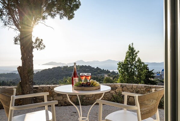 Lavender suite is located on the ground floor and offers an amazing view. Featuring a private entrance, this air-conditioned suite consists of 1 living room, 1 separate bedroom and 1 bathroom with a walk-in shower and a hairdryer. Guests can prepare meals in the kitchenette that comes with a stovetop, a refrigerator, kitchenware and a microwave. Boasting a terrace with sea views, this suite provides a flat-screen TV with streaming services and free wi-fi . The unit offers 1 King bed or two single beds upon request in the bedroom and a sofa - bed for 2 extra guests in the living room.
