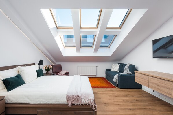 Denne romslige leiligheten (102 m2) ligger i 2. og 3. etasje og har klimaanlegg. Den består av en stue / stue, vedlegg kjøkken og et toalett nede. Ovenpå er to store soverom (24 m2 og 20 m2), begge med seks karakteristiske takvinduer (som kan være delvis eller helt skjult).