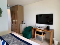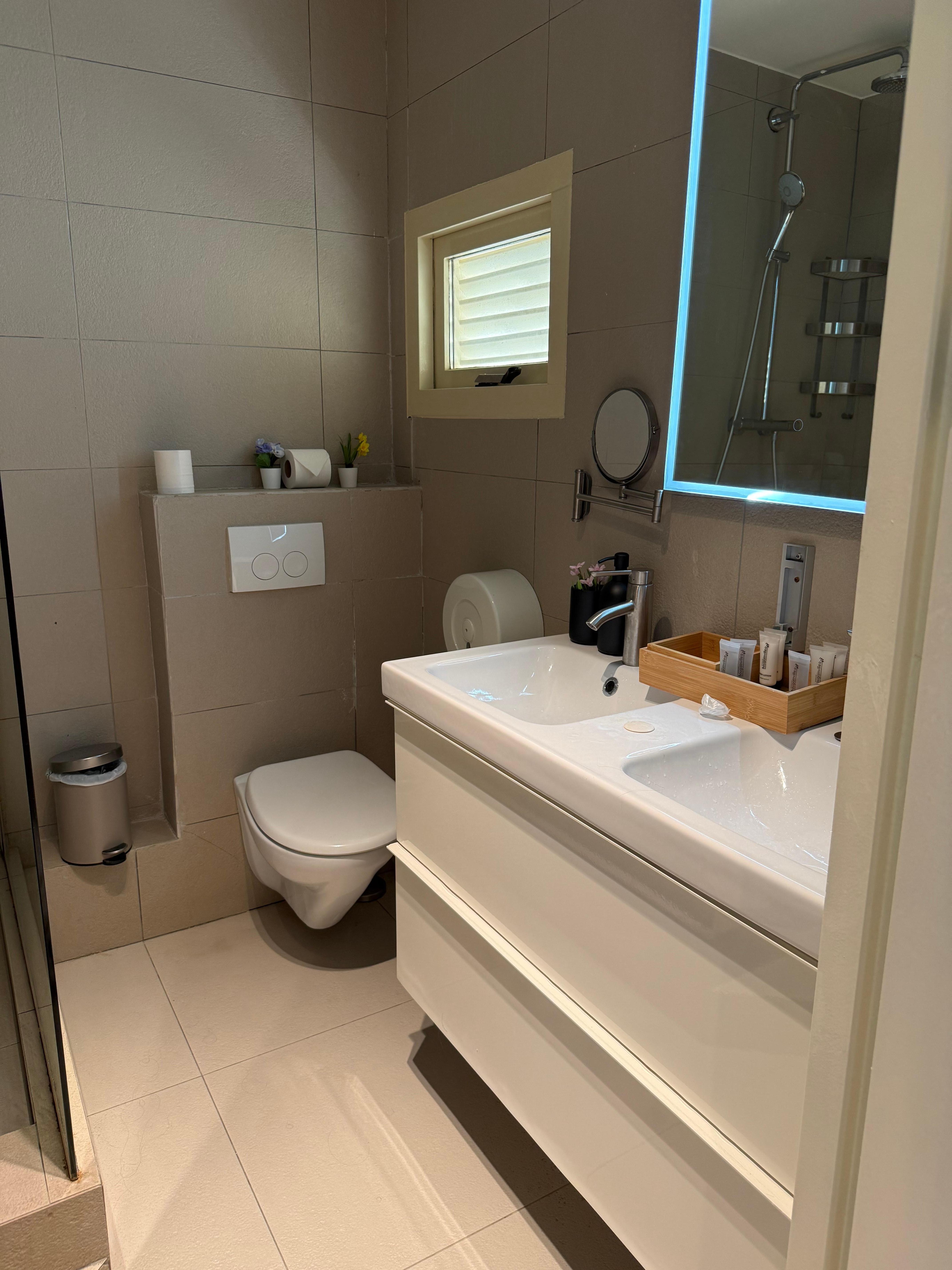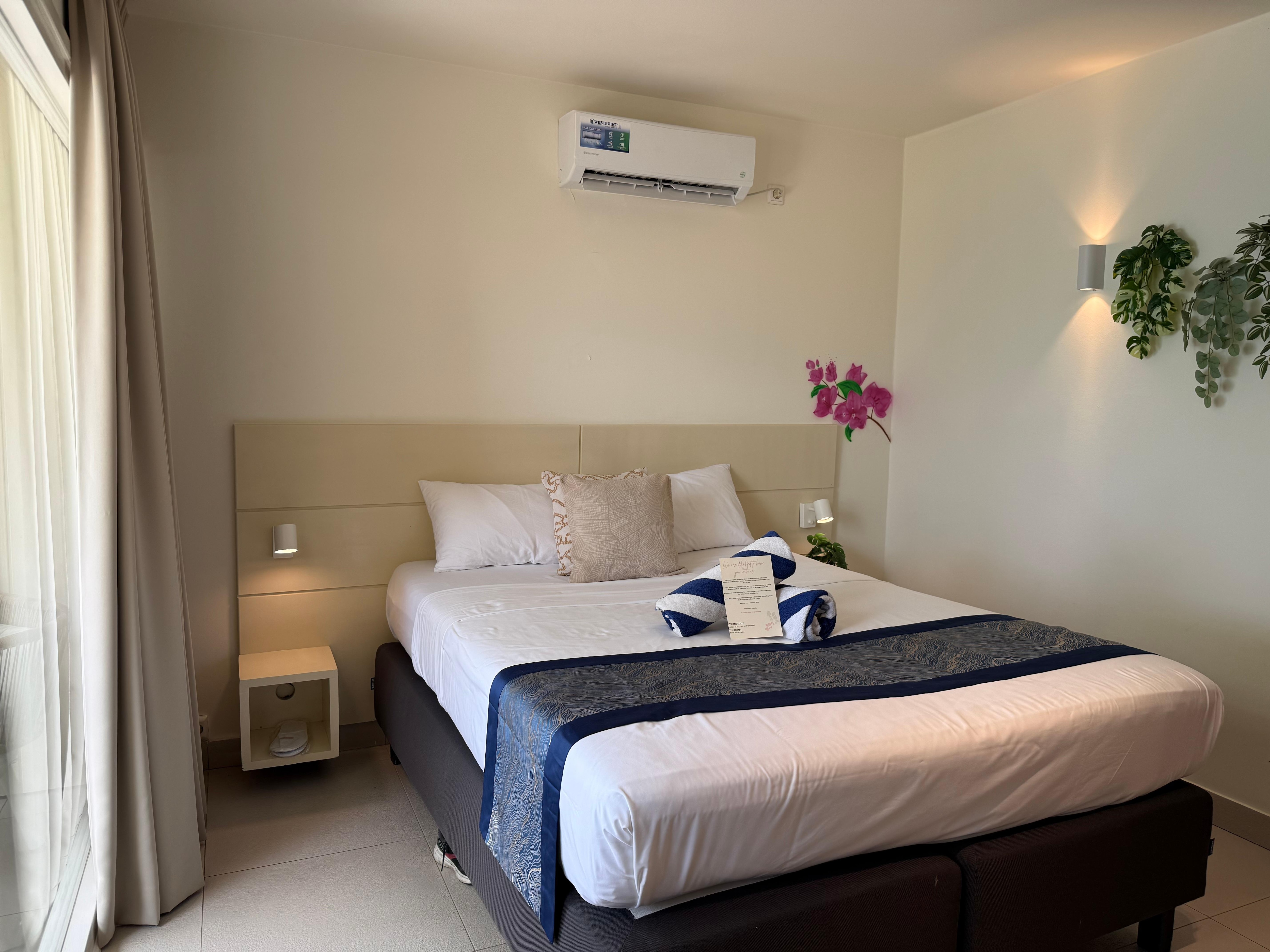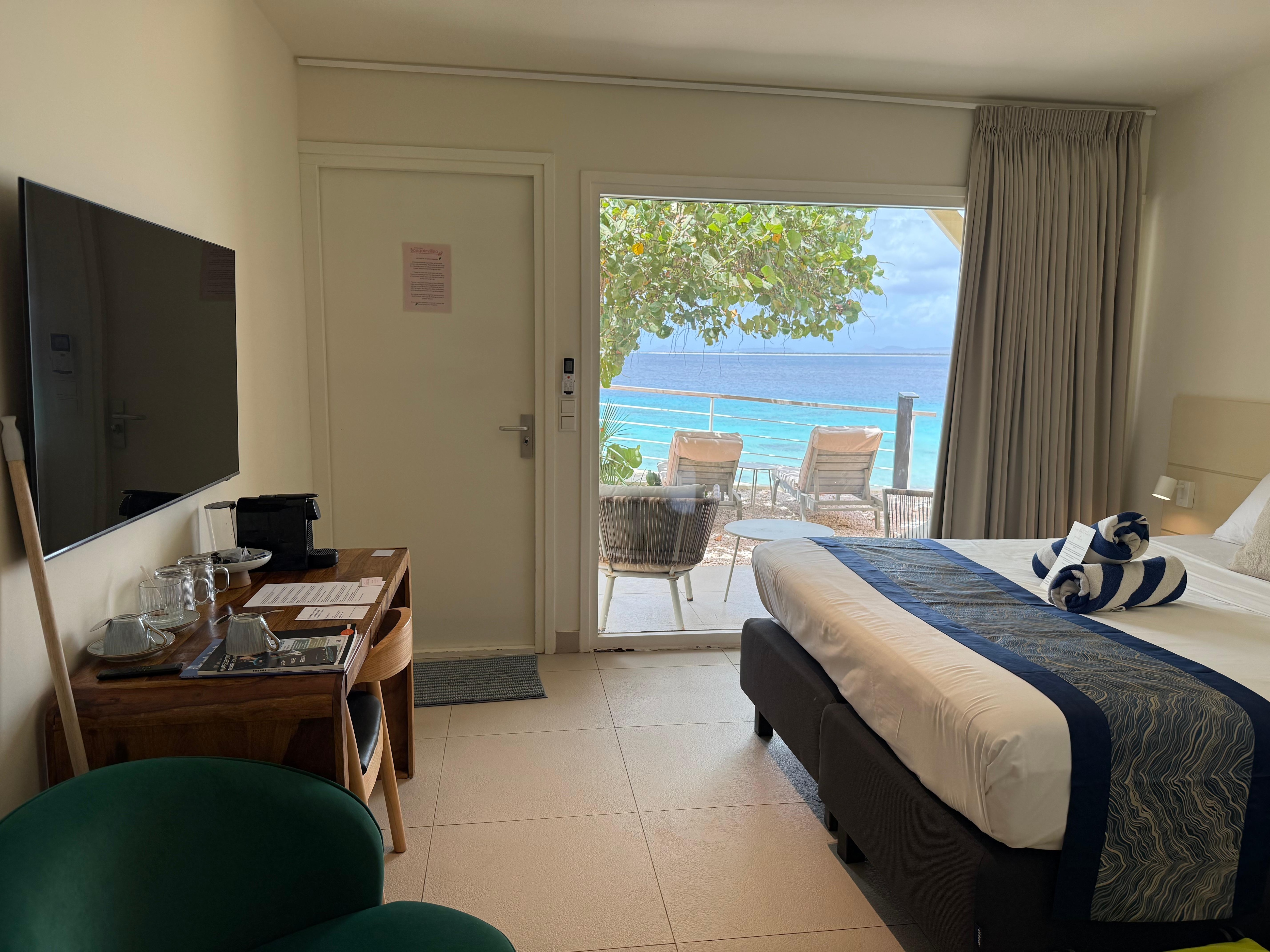 Overall we enjoyed our stay. We stayed in one of the cabins and loved being steps away from the water. The room has a large window with a great view of the ocean, but on the flip side anyone walking by to go down to the beach has a great view of your room. (The hotel has very few rooms, so not many people pass by, but you don’t want to be changing with the curtains open if they do!) The room had a good amount of storage space but in the bathroom the counter space is almost none due to the double sinks. There was also little room between the toilet and the counter. The shower was odd in that there is no door or curtain, and you have to go up a couple of steps. The hotel offers a transfer from the airport for a fee, which we’d set up, but when we arrived at the airport there was no one to pick us up. We ended up getting a taxi on our own which turned out to be cheaper. The biggest surprise for us was finding out that the hotel is right near the airport and planes fly right overhead when they’re landing. Luckily there were no planes during the night, so we were able to hear the waves from the ocean. We found the staff were very friendly and always happy to help, whether it was a needing an outlet adapter or arranging a car rental at the last minute. The highlight was the snorkeling! With the convenience of being right by the ocean, we’d snorkel multiple times a day and even saw a sea turtle two days in a row! As long as you’re aware of the planes overhead, I’d recommend here.
