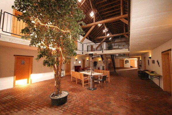 The "Gulf", i.e. the centre section of the barn, has been converted into a large "village square" with a gallery above, which can be reached via a large flight of steps. In the village square you can end the day with a cool beer or a glass of wine in the company of nice people. In the "Gulf" you will find other usable rooms. These include the children's playroom and the communal table football room. A car parking space is available directly at the house.