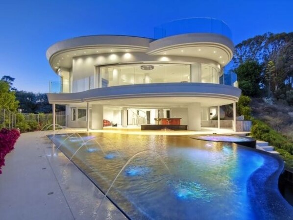 Ta denne trappen eller heisen ned til nedre etasje og bakgård. Det er 3 gjesterom med queen size-senger og eget bad og walk in closets, et stort vaskerom, et ekstra gjestebad / dusj og en vinkjeller. En stue i denne etasjen åpner i en stor overbygd loggia gjennom en 25 meter buet glassautomatisert dør. Når denne døren åpnes, forbinder den en innendørs-utendørs bar. Denne bassengsiden, havutsikt, dekket loggia er utmerket for intime familie sammenkomster. Den oppvarmede, 360 graders uendelig kanten, svarte bunnbasseng er utstyrt med romantiske fontener og lys. Det er fantastisk havutsikt fra dette bassenget / spaet. Nyt matlaging her med utekjøkken og grill. Utover denne koselige bakgården er en vakker ubeboet dyp canyon og Stillehavet.