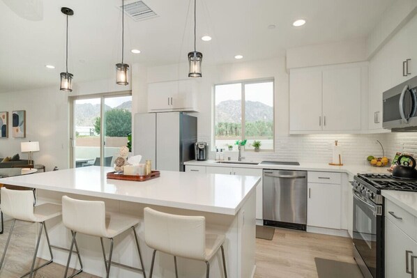 The heart of the home! Oversized kitchen island with 3 barstools and quartz countertops. Brand new stainless steel appliances. Round glass dining room table seats 6.