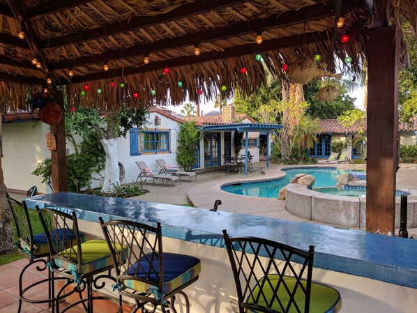 Besøkende vil være like fornøyd med den vakre saltvannsbasseng, komplett med jacuzzi og svømme opp stranden. Den omkringliggende uteplass gir for mange alternativer soling, og gir også de som foretrekker litt skygge, evnen til å slappe av dagen bort i en komfortabel hengekøye, hang blant de modne appelsintrær som grenser til bassengområdet. En grill master drøm venter på et stort utendørs Palapa ved bassenget. Den fulle utekjøkken kan skilte med en gassgrill, vask, bardisk med sitteplasser for seks, samt en stor overbygd spiseplass som vil lett plass 20. Ved siden av scenen er en stor gass brann pit, laget for steking marshmallows under stjernelyset, eller for å glede gjester med varm ambient bålet mens du holder noen kulden i sjakk. Den frodige plen og tropiske blomsterbed hele eiendommen låne en tropisk oase følelse i motsetning til de omkringliggende lyse, solfylte ørkenen.