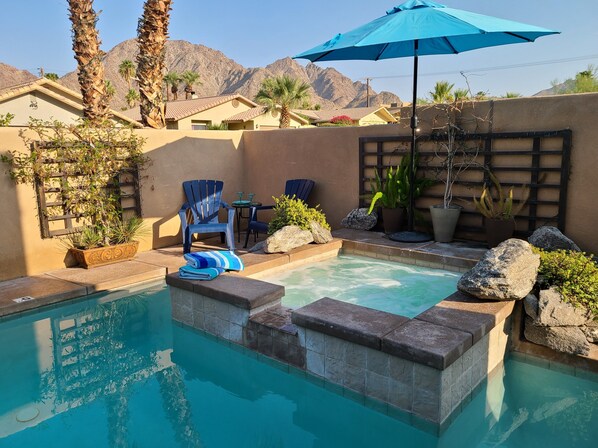 Pool is not heated but will be warmed by desert sun from spring through fall. Hot tub heat is complimentary.