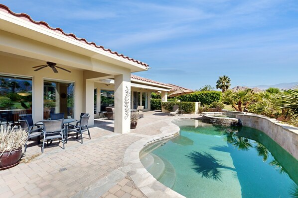Escape to this beautifully decorated house in La Quinta, CA, where luxury meets comfort. This stunning property features a casita and boasts breathtaking views of the mountains and desert landscape. The highlight of this home is the master bedroom with sliding glass doors that lead to a pool and spa area, offering a serene retreat right at your fingertips.