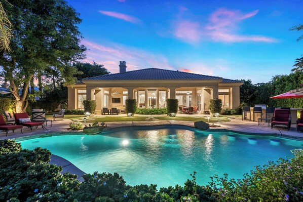 Tropicale at PGA is a beautiful 5 bedroom, 4.5 bath villa overlooking the Weiskopf course. The outdoors features a saltwater pool with tanning shelf and in-pool seating, spa, firepit, BBQ island, al fresco dining and covered outdoor living room with TV. The 4400 square foot interior has a spacious great room with gas fireplace, wet bar and pool table, a fully equipped kitchen, and 5 comfortable bedrooms. It's the perfect place to enjoy all the desert has to offer!