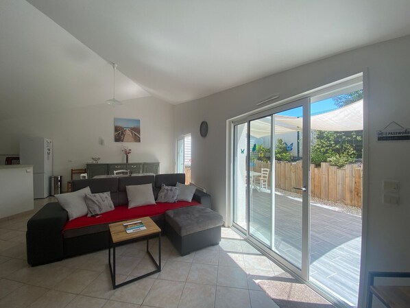 TRANCHE ON SEA, fyret. Veldig fint hus med en fin dekorasjon nær stranden og skogen med 1 stue - kjøkken, 1 soverom med 1 seng 160 og 1 soverom med 1 seng 90 og 1 seng 140, 1 toalett, 1 bad (dusj , servant). 1 parkeringsplass, 1 terrasse som gir sør med stue i hagen. Utstyr: 1 kjøleskap, elektrisk komfyr, oppvaskmaskin, vaskemaskin, mikrobølgeovn, kaffetrakter, støvsuger, servise og bestikk ... Sluttrengjøring på bestilling: pakke på 50 €. Sengetøy er ikke inkludert. Situasjon: På ca 350 m fra stranden, 2 km fra sentrum og 450 m fra skogen (turstier).