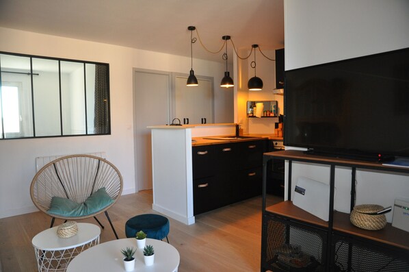 Completely renovated with taste, this accommodation offers functional and comfortable spaces for a seaside holiday. The living area is fitted with a sofa, an armchair, a television, a WIFI box and a sideboard, creating a friendly space to relax after the beach. The open kitchen is perfectly equipped with ceramic hobs, oven, microwave, refrigerator with freezer, dishwasher, storage as well as crockery and kitchen utensils.