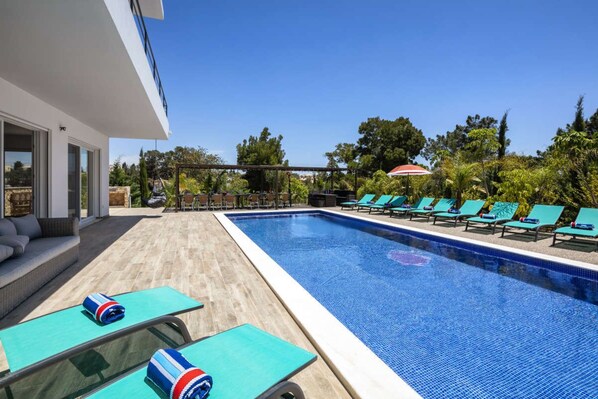 The villa accommodates up to 14 guests and is arranged to balance generous shared living areas with well-proportioned private bedroom suites. Outdoor areas include a private heated swimming pool, included in the rental price, surrounded by terraces and seating areas suitable for outdoor dining and relaxed group living throughout the day.