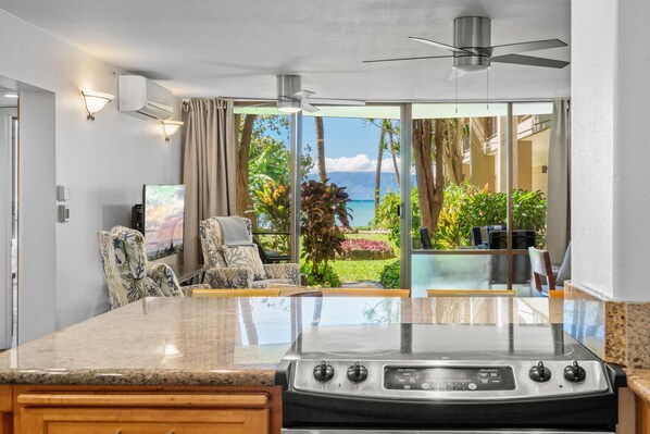 This private 2 bedroom 2 bath ground floor unit provides nice ocean views and easy ocean access on the west side of Maui. Walk just a few feet out your unit to the ocean and bask in the sand! This unit offers lots of lanai space for you to enjoy and is close to the pool and BBQ's at the resort. When you're ready, go for a swim in the ocean, surf at Pohaku Park, or just enjoy the beautiful ocean views. The well appointed kitchen and dining room are ready for the evenings you decide to stay in and cook. Walk to the shops and restaurants at Kahana Gateway and Kahana Manor.