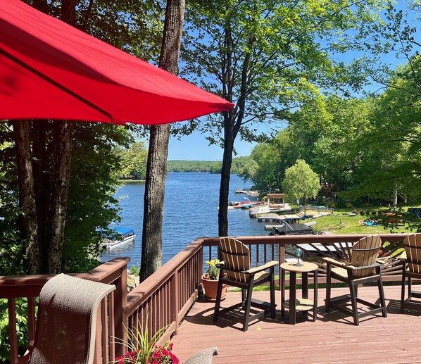 This unique house is perched lakefront with a large wrap around deck, stunning views of the lake and a front row seat to the bald eagle's nest across the cove. The sloping lawn leads to a patio with a fire pit near the water's edge. This home is on a quiet, "no wake" zone so enjoy the lake without all of the noise. Fish, swim, relax on the dock or take the canoe provided out for a spin. A cabin feel with all of the upgrades.