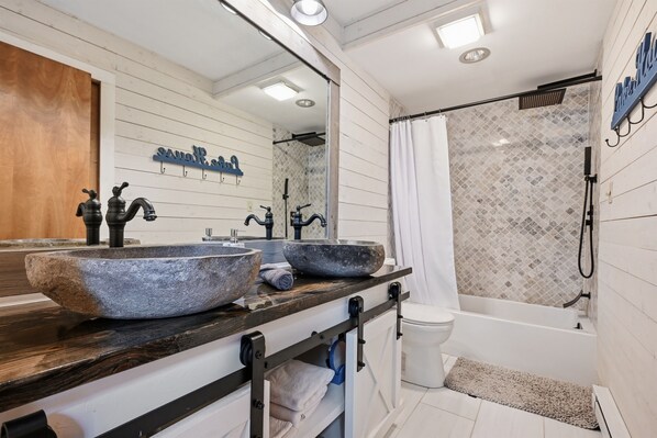 Cook up a feast in the updated kitchen with **Quartz countertops**, a rock tile backsplash, and under-cabinet lighting. The open-plan living area includes a **wood-burning fireplace** and high-speed WiFi, perfect for working from home or streaming your favorite shows on two flat-screen smart TVs.