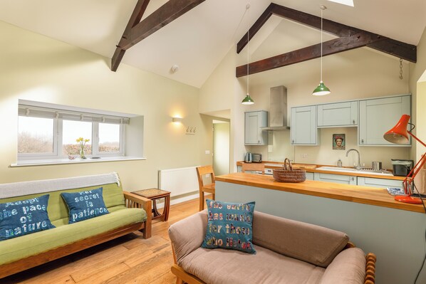 The cottage is situated on a very quiet road and between 3 fields that are protected habitats, and as such are un-farmed and therefore, a haven for wildlife. It is single storey and has only small steps to enter. One bedroom with a kingsize bed and storage space. I use only top quality 100% cotton bed linen. The lounge has a double sofa bed futon and also a single sofa bed futon, thus the cottage can sleep up to 5 people. (Please look at photos to decide if you would like this cosy space) 42" Smart TV in the lounge with Netflix provided. Cottage has fibre broadband. Bedding is provided for all the beds, and towels are provided for all the guests. There is a wood burner in the lounge and a basket of wood will be provided. A fire guard is available on request. There is a fire bowl in the garden where you can burn the wood or have a barbecue. The modern kitchen is separated from the lounge by a breakfast bar. Tea and coffee and sugar are provided. There is a patio to the rear of the cottage that has a table and 5 chairs. There is a garden all round the cottage with 2 lawned areas. The garden is enclosed with a fence and hedgerows. The garden does have a drop onto the driveway, (see photos), that is not railed in any way.