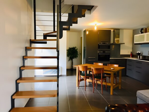 This holiday home features a living room with open kitchen, 4 spacious bedrooms, a mezzanine, a bathroom, 2 shower rooms, and 3 toilets. Two bedrooms are on the ground floor—one with a 140 cm bed, the other with a 160 cm bed. Upstairs, there are two more bedrooms: one with a 160 cm bed, the other with two 90 cm beds.