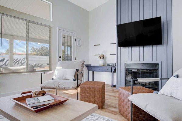 Our living room features a Smart TV (with access to all major streaming sites) for you to watch your favorite show.