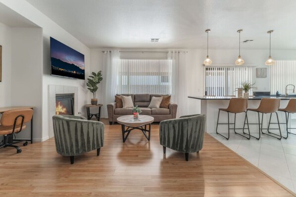 Step into a modern, well-appointed 2-story Las Vegas home featuring 5 spacious bedrooms and 3 full bathrooms, comfortably sleeping up to 12 guests, foosball game area, cozy living spaces with smart TV and comfy sofas, and a relaxing backyard lounge—a perfect blend of indoor entertainment and outdoor relaxation. Thoughtful design and open flow offer room to unwind, socialize, or kick back after a day exploring Sin City.