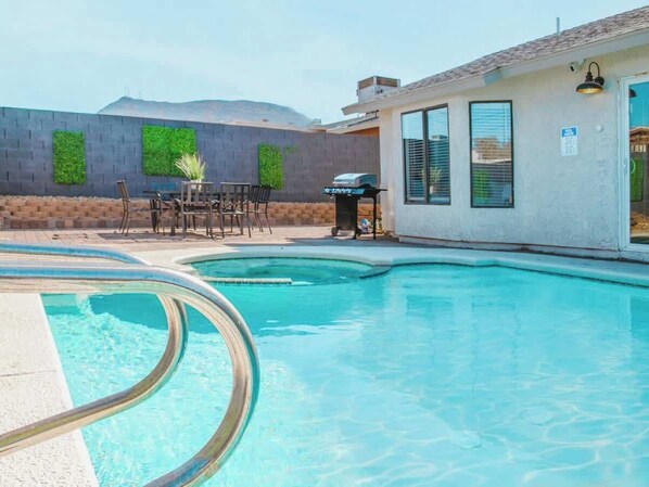 In the backyard, we also have a BBQ and utensils for fun meals outside, as well as a refreshing swimming pool with sun loungers, perfect for Las Vegas summers.