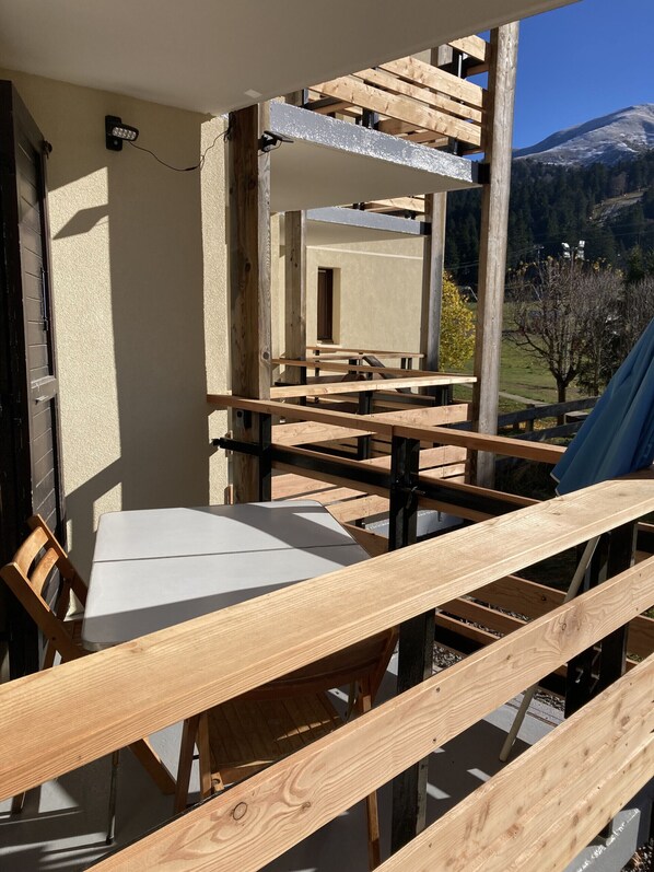 This accommodation offers a warm living area with TV and its perfectly and comfortably equipped kitchen (fridge/freezer, microwave, dishes, raclette machine, panini maker, fondue maker, filter coffee machine, Senseo coffee machine, crepe maker, immersion blender, toaster, kettle, dishwasher, vitroceramic hob, powerful extractor...), which opens onto the balcony with direct outdoor access where you can put on your skis.