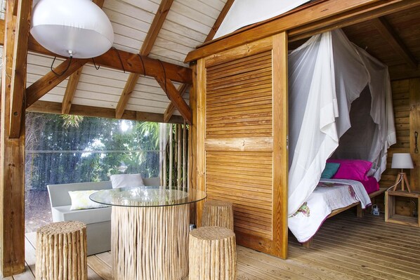 The interior of the villa features an air-conditioned bedroom with a 160 cm bed, separated from the living room by a curtain, and an adjoining bathroom.