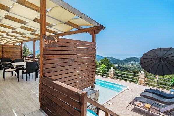 Located at the village of Lefkada, Chortata, in a lush greenery,20 minutes from cosmopolitan city of Lefkada and 10 minutes from the awarded beach of Porto Katsiki. It consists of 5 apartments,which all of them have panoramic view to the sea,which will surely amaze you. The sandy beach of Kathisma is just a few minutes away. There is also a swimming pool with sunbeds and umbrellas where you can enjoy and relax with your friends. In the pool area you will find the pool bar where offered coffees, soft drinks and snacks. Wi-Fi internet is available in the rooms and in all puiblic spaces and is free. In all the apartments you can enjoy a fully furnished balcony with pool and mountain views. The well-equipped kitchen gives you the option to make your own meal, in addition you have access to your private barbeque. Built on a very quiet place where you can relax and enjoy your holidays but not far from the city of Lefkada where you can find restaurants, supermarkets, cafes, bars and anything else you need. The complex also has parking for your car or bike.