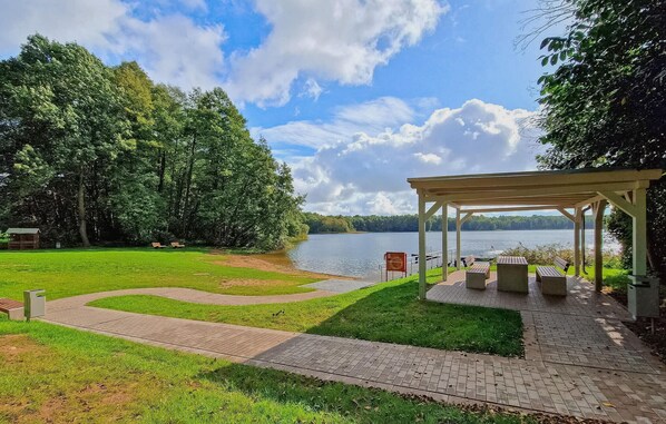 Ferieleiligheten med egen inngang ligger rolig til i utkanten av Woldzegarten, i skråningen ned mot Tangahner See, og ligger i første etasje i et bolighus på en naturtomt på ca. 100 m². 900 kvadratmeter. Det er bare ca. 350 meter til det nyopprettede badeområdet med en liten lekeplass. En restaurant ligger ca. 6 km unna (i Kogel eller Roez), og det finnes flere restauranter og shoppingmuligheter i byene Malchow eller Röbel (ca. 10 km). Turistsenteret Waren (Müritz) ligger 24 km unna. Den ca. 45 kvadratmeter store, sentraloppvarmede, røykfrie leiligheten, som ble delvis renovert i 2023 og utstyrt med insektnett på vinduene, har en stue i inngangspartiet (gjennomgangsrom) med sovesofa, flatskjerm-TV og radio, et separat kjøkken (2023), et bad med dusj og toalett, et separat kjøkken (renovert i 2023), et bad med dusj og toalett.m radio, et separat kjøkken (renovert i 2023, spiseplass, elektrisk komfyr med stekeovn, kjøleskap, oppvaskmaskin, mikrobølgeovn, kaffemaskin, brødrister, vannkoker), et soverom (dobbeltseng) og et bad renovert i 2023 (dusj i gulvnivå, håndklestang). oppvarming, WC). Leilighetens høydepunkt er den store, møblerte vinterhagen med utsikt over innsjøen, som kan åpnes helt til forsiden og siden. Det er også en grill, en robåt, et sykkelrom, en parkeringsplass og gratis WiFi. Totalprisen inkluderer sluttrengjøring, vann- og energiforbruk. Ta med eget sengetøy og håndklær. Husdyr: Én hund er tillatt i denne ferieboligen (merk: eierne har en barnekjær husky og katter).