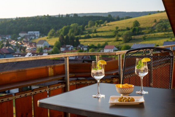 The 90 m² apartment has a large living room, a fully equipped kitchen, 3 bedrooms (2x master bedroom, 1x children's bedroom) and a bathroom with shower and bathtub and toilet, as well as another separate toilet. The facilities also include high-speed Wi-Fi (suitable for video calls), a workstation for home office, 3 flat-screen TVs, a washing machine, a wood-tiled stove and a balcony with a fantastic view of Lenzkirch. In addition, a baby cot and high chair are available, as well as a children's playground for common use in the garden.