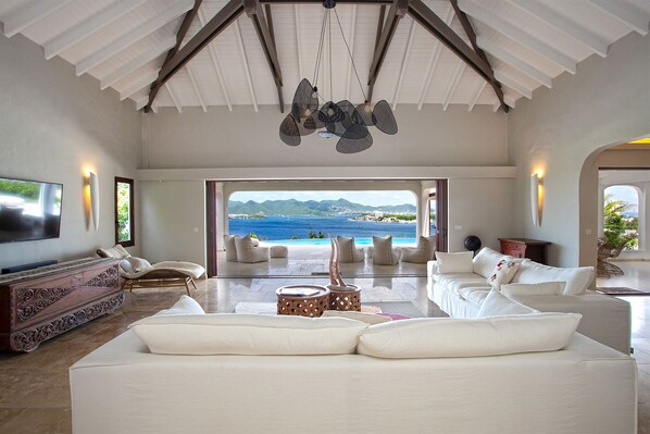 The exterior takes advantage of its prime positioning by highlighting Simpson Bay with an oval infinity heated pool acting as the stage for the view and a rectangular pool next to it; why have one pool when there could be two? A separate set of stepping stones, leading from the driveway, extends to an outdoor kitchen that is situated next to the rectangular pool. This creates the perfect place for hosting an event, while separate from the main villa. The kitchen includes a barbeque, a breakfast bar and a dining table beneath a dome structure acting as a culinary cocoon from the sun. Adjacent to this structure is a hidden alcove for reading a book or sparking conversation among friends. A concealed flight of steps, between the pools, leads visitors to a viewing area in which they can observe the sunset while sipping champagne. The additional outdoor dining table is located closer to the home, suited for cooking a casual meal or perhaps hiring a private chef to further embrace the scenery.