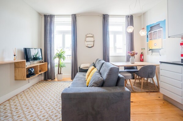 The bright living room has a convertible sofabed and a cable TV. After a long day in the city, relax in the bright space. Several windows brighten the room and give guests a stunning view of Lisbon during their stay.