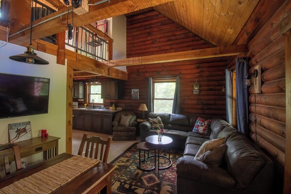 The house offers a semi open floor plan that effortlessly flows from kitchen (with basic cutlery, dishes, pots, pans, fridge, stove and microwave) to living room and large dining area that features a huge comfy couch, table large enough for everyone and plenty of board games, puzzles and TV with Dish network. The fun can continue onto the open loft with a pool table, arcade game system, large scrabble and TV. All can be enjoyed while overlooking the wooded landscape through a huge picture window!
