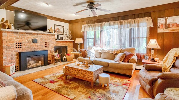 Trapp opp fra spisestue inn i stuen, hvor overstuffed skinnmøbler, peis og flatskjerm kabel-TV vil gjøre innendørs tid bare så avslappende som utendørs. Gjennom en liten gang finner du hovedsoverommet, med en queen size-seng og eget separat toalett.