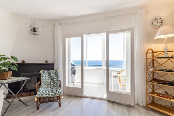 You have to go up some stairs to get to the apartment. There is a bright open-plan space with a kitchen and lounge-dining room. The lounge has a double sofa-bed, 3 armchairs, coffee table, TV, decorative fireplace and other furniture and direct access to the terrace, completely enclosed with large windows and views of the sea and coast. In this space there is a table, chairs and barbecue. The kitchen is equipped with fridge-freezer, vitroceramic hob, mini oven-grill, microwave, dishwasher, filter coffee maker and tableware. There is also a vacuum cleaner, iron and ironing board in the house.