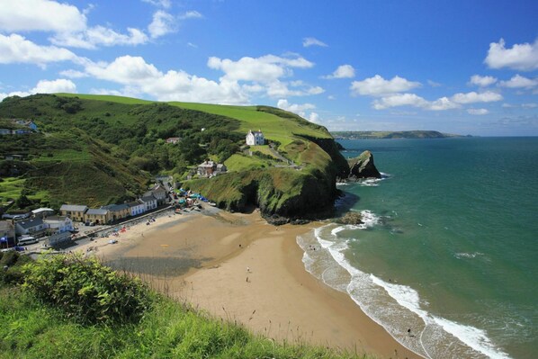 Ceredigion Coast Path has 60 miles of spectacular coastal scenery, wildlife, beaches, and dramatic sea cliffs to explore. To the south, there is a long sandy beach at Penbryn and the village of Tresaith has a pub with fantastic views over Cardigan Bay.