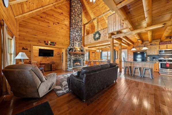 Inside the lodge, rustic charm meets modern comfort. Kick back in the open-concept living room with soaring ceilings, cozy couches, and big windows that bring the outdoors in. Challenge your crew to a round of billiards on the full-size pool table, play cards at the game table, or settle in for movie night in the main gathering area. The fully stocked kitchen makes cooking for a crowd a breeze, with modern appliances, plenty of prep space, and all the cookware and dishes you'll need.
