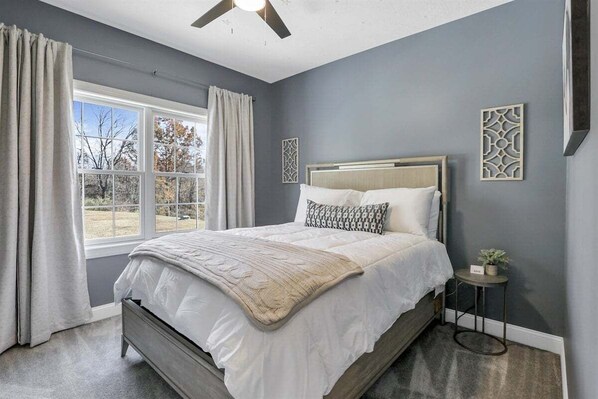 The second bedroom features a queen-sized memory foam mattress with soft, cozy linens for a restful night's sleep. You'll also find a 50" TV for added convenience, a ceiling fan to keep things cool, bedside lamps for evening light, and a walk-in closet for easy storage.