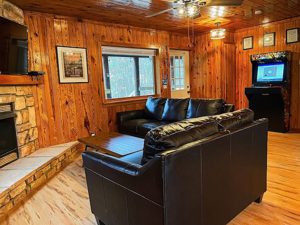 As you continue to the living area you will have a gas fireplace and a 50"TV surrounded by a large leather sofa and loveseat. The perfect spot to cuddle up with friends for a movie or to chat by the fire. The front of the cabin features a large picture window with beautiful views of the pond and surrounding forest.