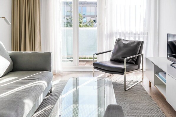 • Living Area: Open-plan lounge with sofa, dining table, and direct access to the balcony. Large windows create a light-filled setting.