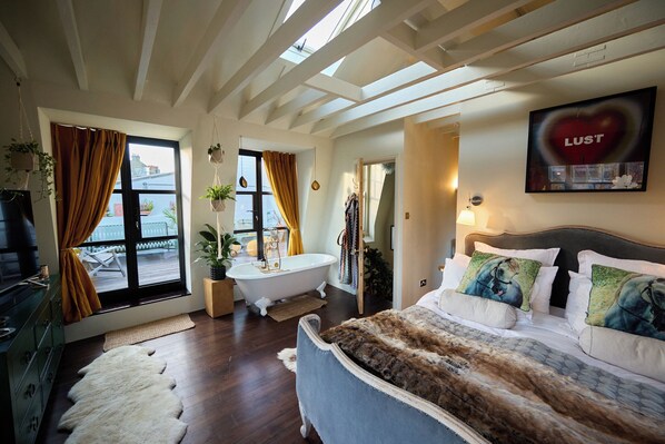 And then — the crown jewel: a breathtaking master suite where a freestanding bathtub takes pride of place in the centre of the room, inviting you to luxuriate in style. Swing open the doors to your own private rooftop terrace, an atmospheric hideaway with twinkling city views, a pizza oven, plancha grill, gas heater, and layers of blankets to keep the party going long into London’s cool night air.