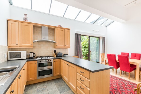 Ovenpå i første etasje har hovedsoverommet en dobbeltseng og rikelig med garderobeskap og er veldig stille når det vender ut mot hagen. Ved siden av dette er tomannsrom, som har to enkeltsenger, og deretter enkeltrom som har enkeltseng og er lite. Det doble soverommet og det ene soverommet har utsikt over gaten foran huset, men er fortsatt veldig stille. Familiebadet har badekar og separat dusj.