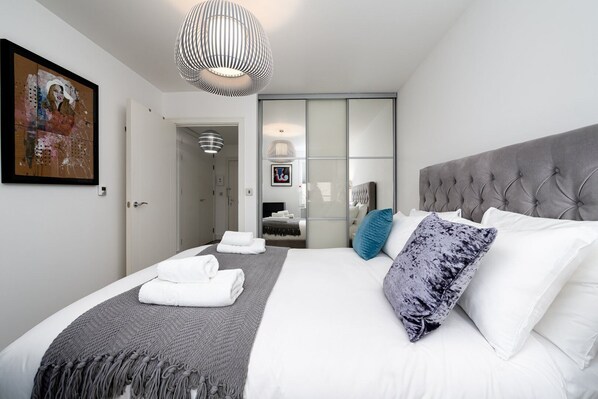 The bedroom is delightfully furnished with a king bed, a wardrobe and complimentary hotel-quality linens for maximum comfort.