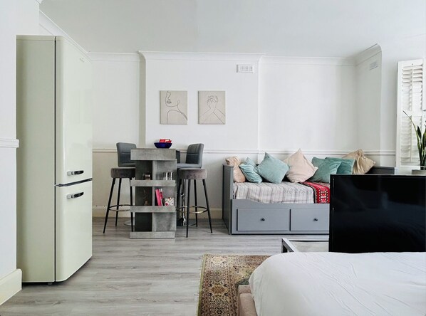 The king size bed has a luxury spring foam mattress, as well as a large sofa and double size sofa bed. The en-suite shower room is brand new and the kitchenette is equipped with a full size retro fridge freezer, over counter oven & hobs and a washer dryer. As well as a large air conditioning unit.