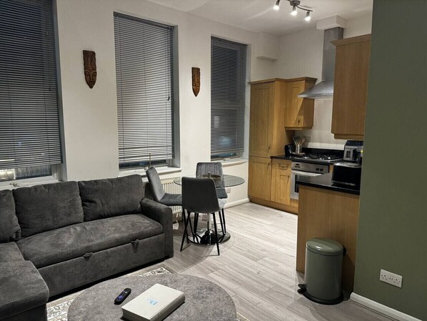 Modern one-bedroom flat with fast Tube links and in-home laundry