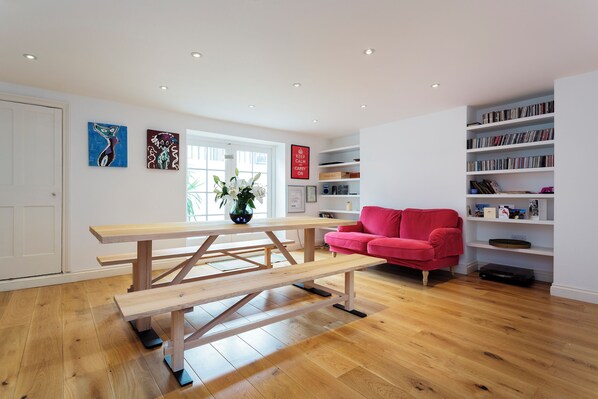 Når du kommer inn på eiendommen, vil du finne en romslig stue mot venstre, fullt møblert i tregulv, som er mye av eiendommen, og med to imponerende marmorpeiser. Stuen er utstyrt med en luksuriøs fløyelsofa og TV-underholdningsenhet, og gir gjester en behagelig plass å slappe av i. Studieområdet har et skrivebord med datamaskin som gjestene kan bruke, samt en rekke interessante bøker å bla gjennom! På slutten av hovedkorridoren er et praktisk pulverrom som har badekar i full størrelse. Det nedre nivået av huset inneholder et plettfritt kjøkken og spisestue, som kan skilte med romslige proporsjoner og en moderne finish. Når du kommer til underetasjen, kommer du direkte inn i spisesalen som er sentrert med et trebenkebord for plass til seks gjester. Det plettfrie kjøkkenet er fullt utstyrt i en moderne design med doble benkeplater og elegante hvite skap. Fasilitetene inkluderer blant annet oppvaskmaskin, vinkjøleskap, gasskomfyr og juice. Kjøkkenet fører deretter pent til en liten uteplass med trinn som fører opp den gresskledde hagen som er fantastisk om sommeren, en fin åpen plass for barn å leke i. Det øverste nivået av huset har fantastiske hvitvaskede tregulv og inneholder tre soverom som har en stilig minimalistisk finish. To av disse har king-size-senger, og ett er et enkelt soverom. Det er ett delt bad i denne etasjen som er veldig godt ferdig med dusjkabinett.