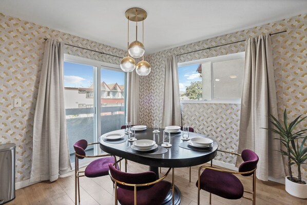 Chic dining table with 5 luxurious velvet chairs.