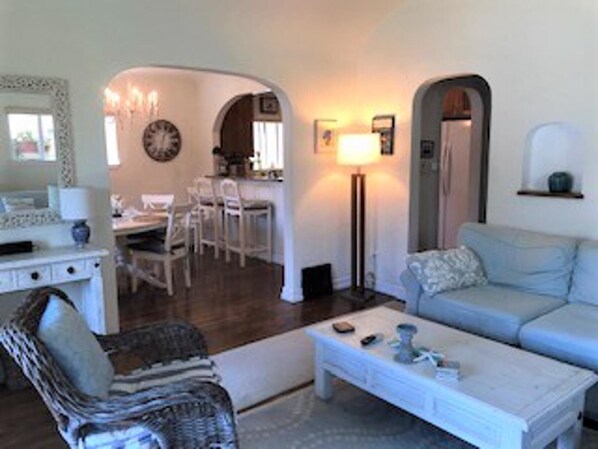 Huset vårt er en spansk kolonialbungalow som dateres tilbake til 1923! Det er totalrenovert med tregulv, granitt benkeplater og teppebelagte soverom. Vi har en bdrm med en CalKing størrelse seng, og ett soverom som har en Queen size seng. Badet har dusj, badekar, toalett og vask. Kjøkkenet er pent gjort med granitt benkeplater, et gassområde, oppvaskmaskin, mikrobølgeovn og kjøleskap / fryser, vaskemaskin og tørketrommel. Stuen er koselig og er innredet i blått og hvitt - perfekt strandhusfarger. Spisestuen har bord og seks stoler. Verandaen har to stoler for å nyte en fin sommer kveld! Forgården har en gressplen, rosenbusker, en lime og andre vakre blomster. Bakgården har en gassgrill og et lite bord og stoler for to. Bakgården er inngjerdet med en port. Over garasjen har vi en annen utleie apt som vil bli okkupert av et profesjonelt par. Parkering er tilgjengelig på gaten. Depositum er $ 700 kontant og $ 100 sluttrengjøring skal tas fra det ved slutten av oppholdet