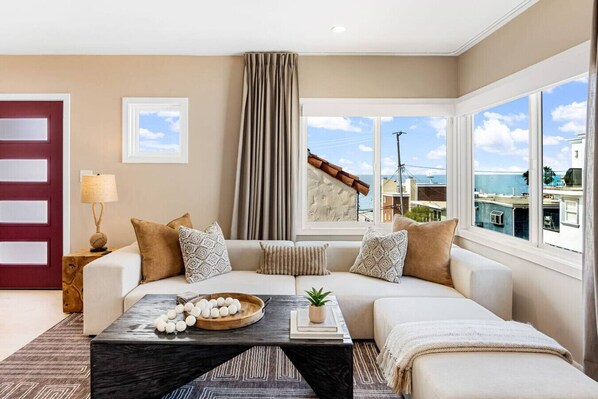 • A bright and spacious living room with captivating ocean views. Enjoy a plush sectional, 65-inch Smart TV and power shades for privacy