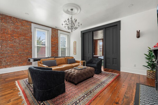 ☀ Living room with tons of comfy seating and shuffle board table