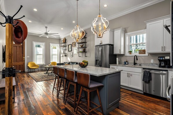 As you walk into the home, you're greeted with the open living room, which has tons of comfy seating and a luxurious design! It's a great place to relax after tours during the day or before heading out for the night.