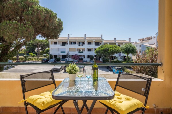 The beautiful holiday apartment Marjoh AL is located in the Quarteira district of Vilamoura, east of Albufeira, in the Algarve. The apartment features a living room, one bedroom and one bathroom, and can accommodate up to 3 people. The kitchen is well equipped with a dining table, toaster, microwave, blender, oven, coffee maker and fridge/freezer. Additional amenities include Wi-Fi, air conditioning and television. On the balcony, furnished with comfortable outdoor furniture, you can start your day with a delicious breakfast. The large shared pool with sun loungers invites you to cool off on hot days and enjoy relaxing hours in the sun. In the immediate vicinity of the apartment, you will find various restaurants, cafés and bars within walking distance (2 to 8 minutes). The nearest supermarket is just a 5-minute walk away (400 m). The beautiful and extensive Vilamoura beach is a 7-minute drive away (2.8 km). Vilamoura is known for its marina, golf courses and casino. The Cerro da Vila archaeological museum displays the ruins of a Roman villa, with baths and mosaics. Falésia beach, surrounded by red cliffs, stretches west towards the fishing village of Olhos de Água, about half an hour by car.